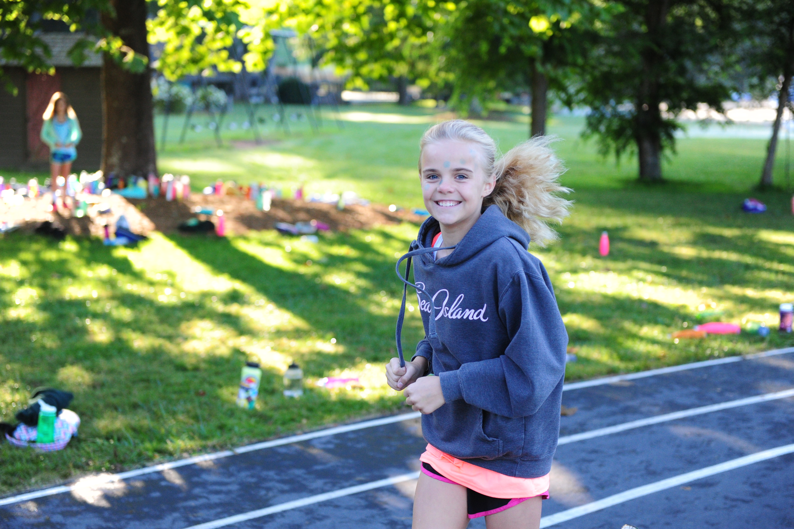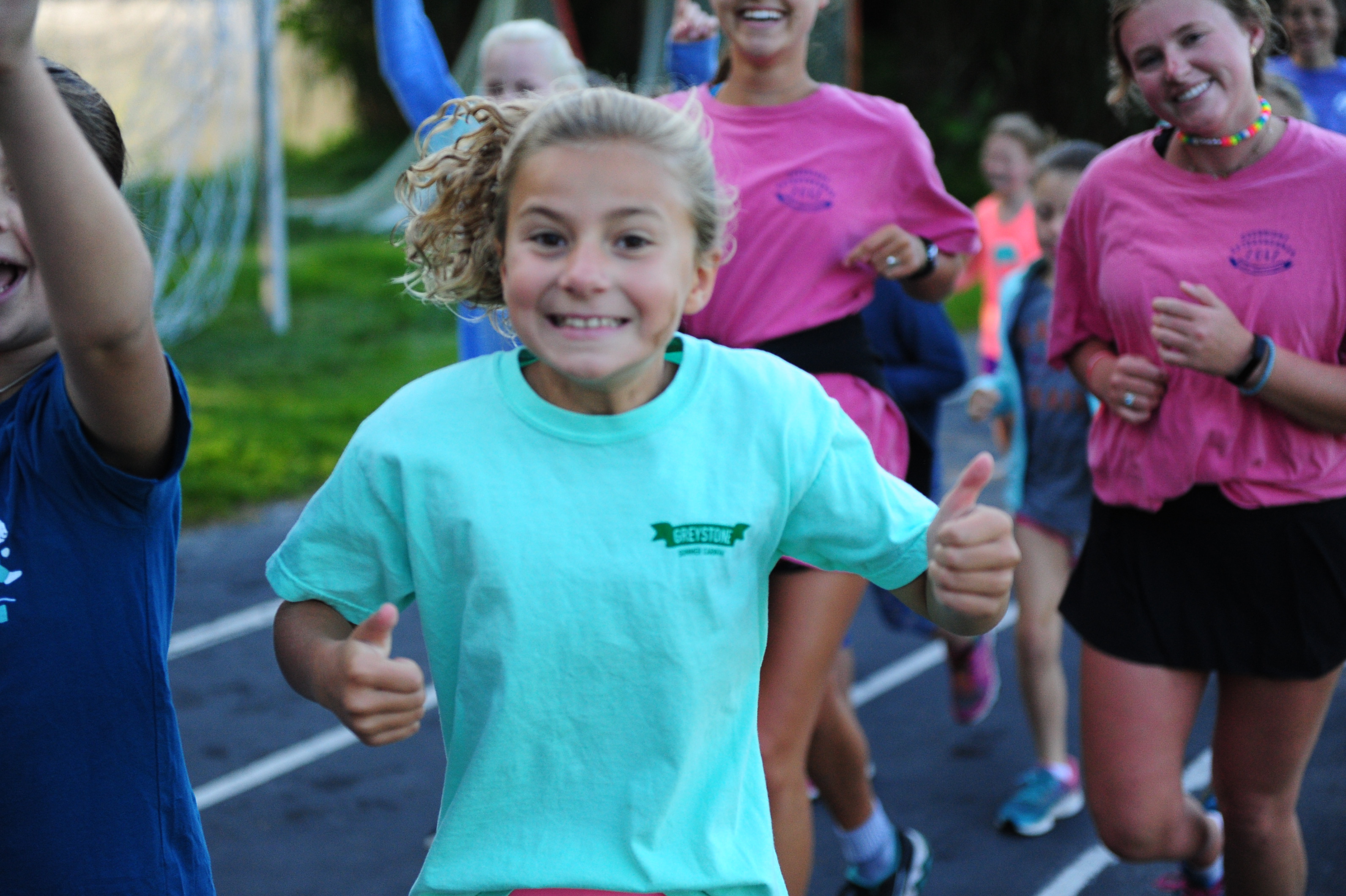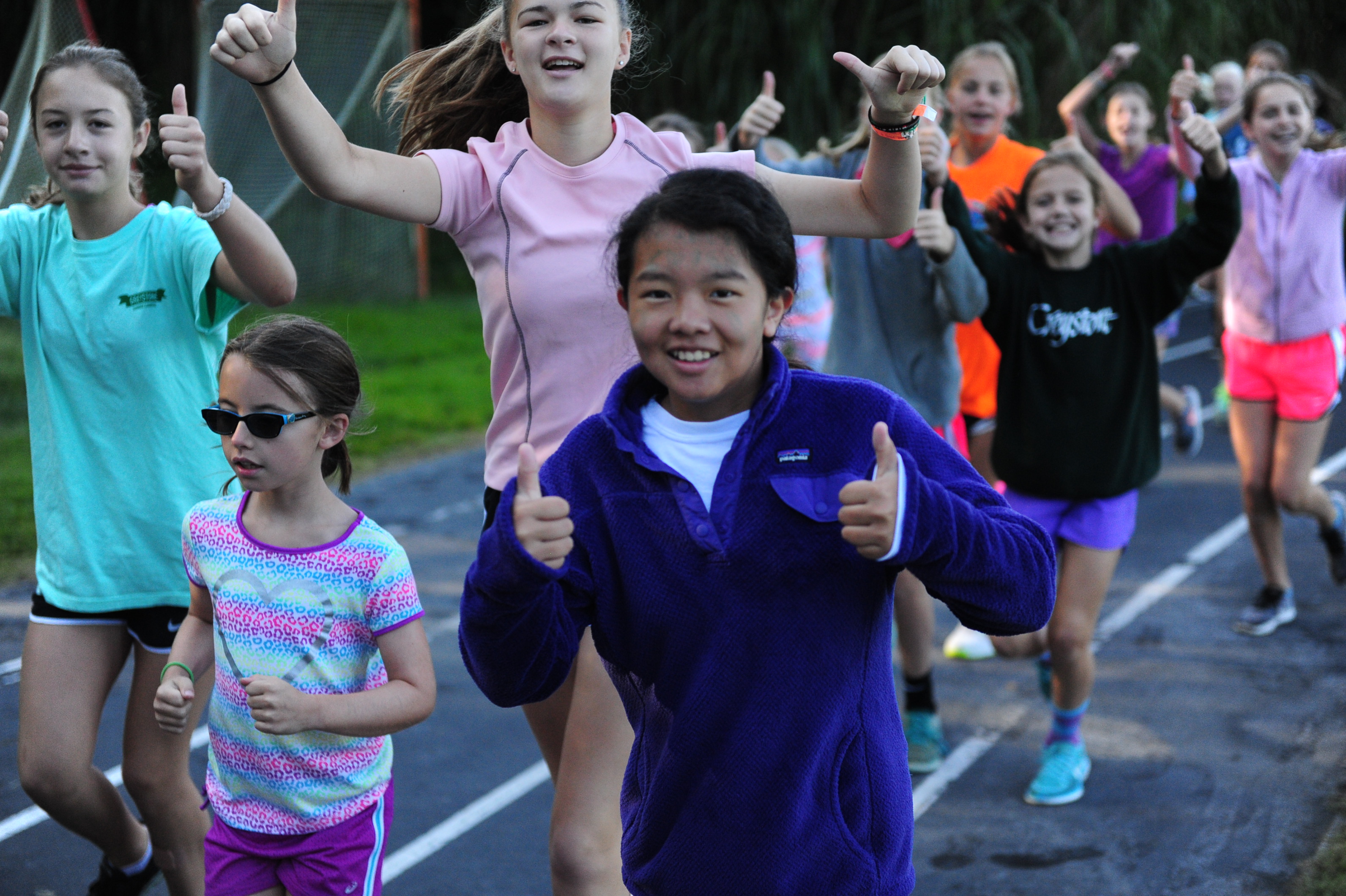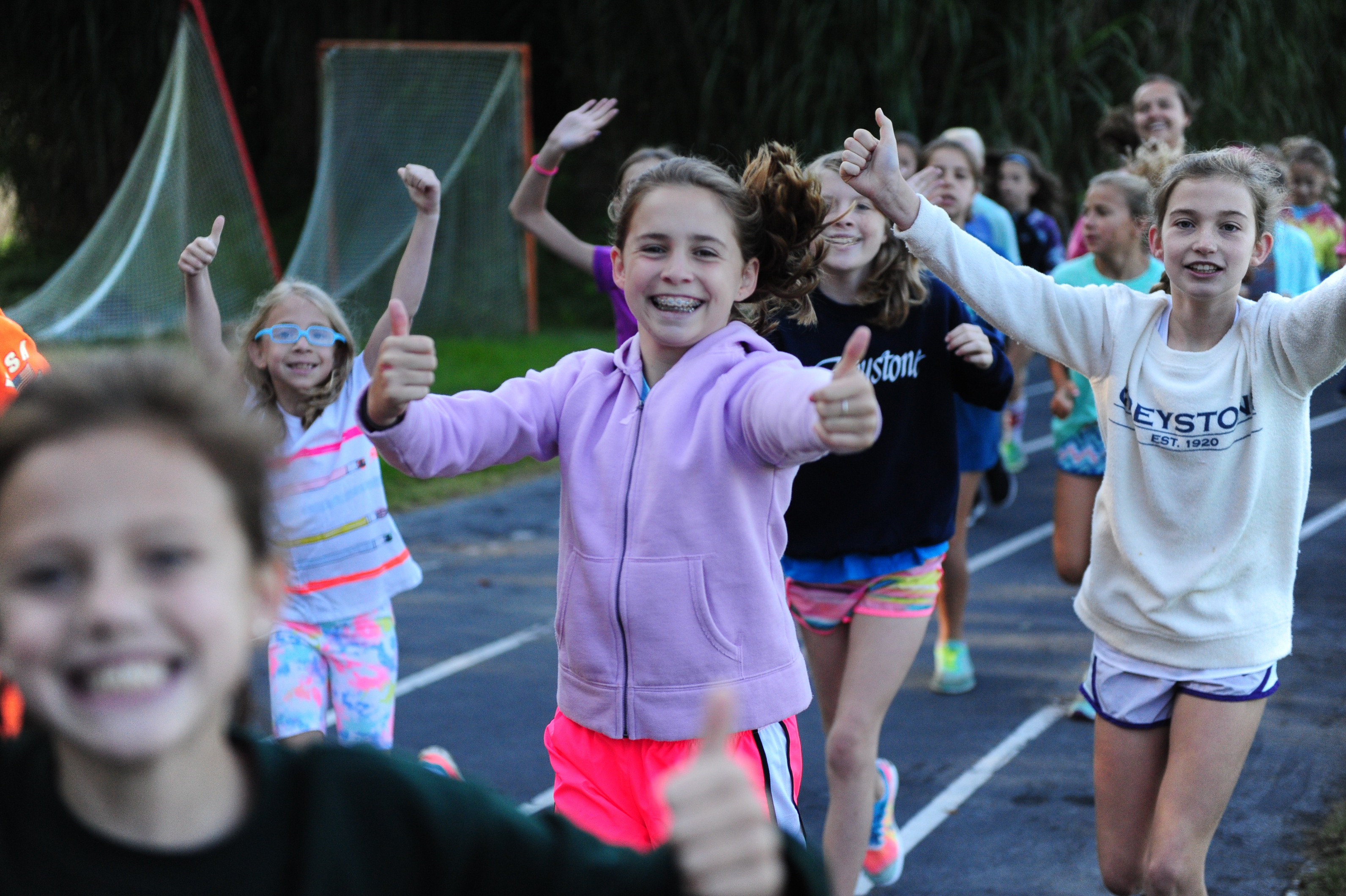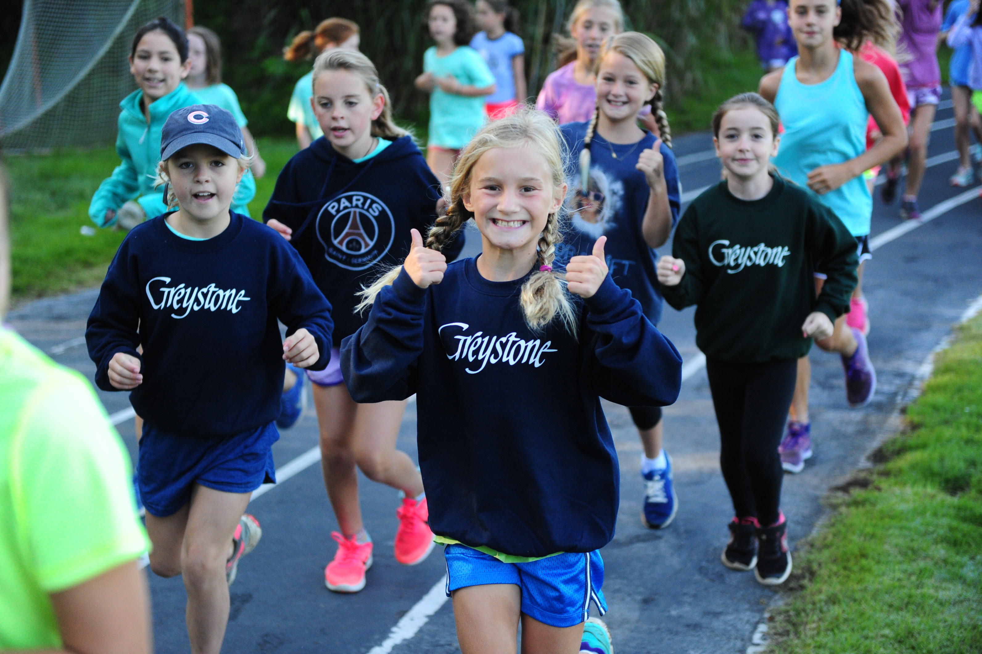 Anyone who does not want to sleep in gathers at the track for a running club (Greystone Stumblers) at 8:00. You would think such a club would not be popular, but you would be mistaken. About 400 girls showed up on a crisp sunny morning to run or walk three miles before breakfast beside the placid waters of Lake Edith. We play music, stretch out, and encourage each other in our training. It really is fun and the girls LOVE getting the prize (a really nice t-shirt in the Greystone Stumblers theme).
