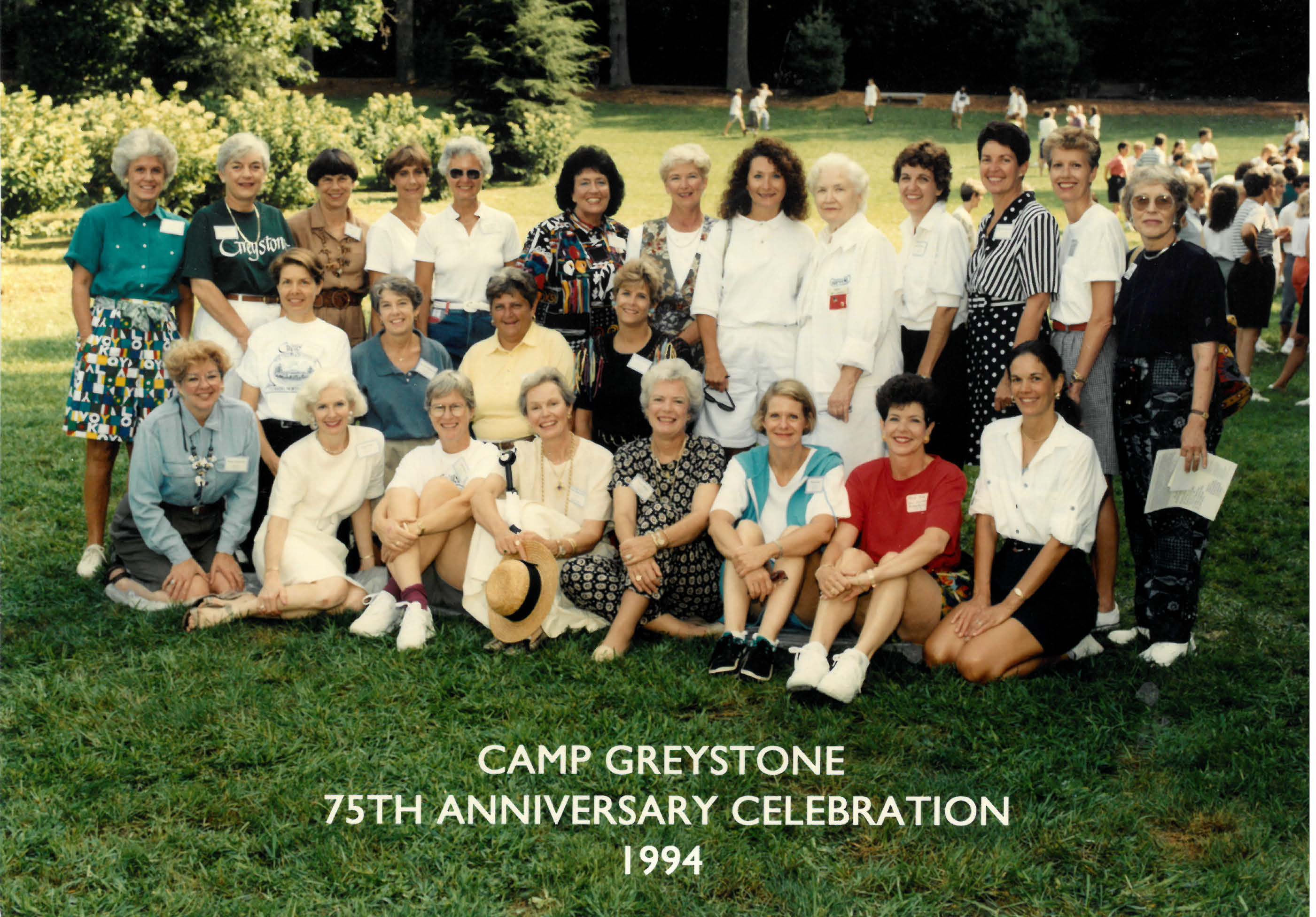 Greystone celebrated its 75th Anniversary in 1994 with a large alumnae reunion during Main Camp. Through the hard work of Elizabeth Abernathy, in culling Greystone’s alumnae mailing list, and Deanie Walburn Strength, in organizing the reunion events, Greystone welcomed over 800 alumnae and their families for the event. Campers performed for the guests, and alumnae enjoyed participating in events like the flag ceremony. It was a wonderful celebration of what God had faithfully done at Greystone for 75 years!
