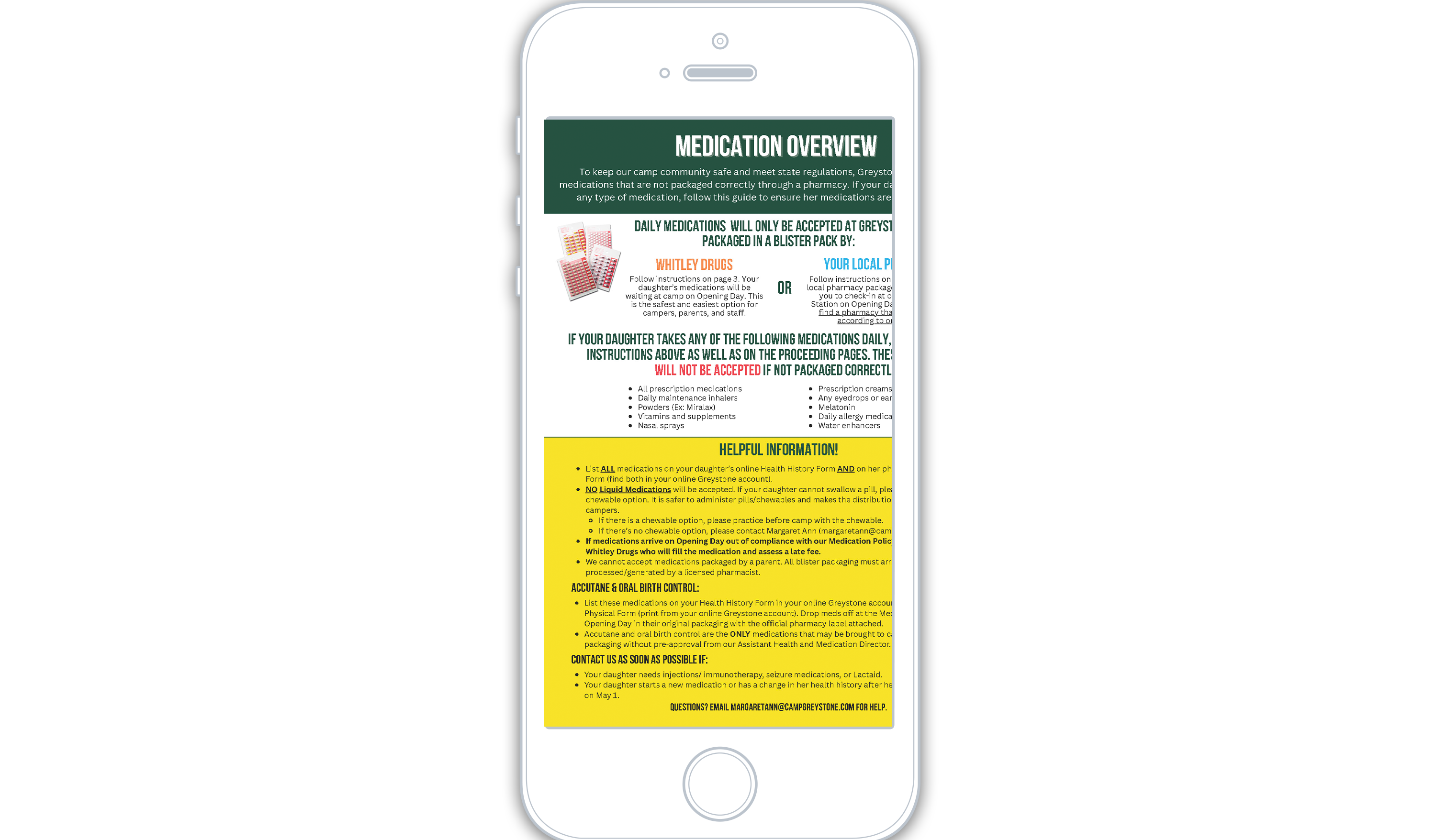 Complete Whitley’s online information (click on “Camp Greystone”). Expect a confirmation text from a pharmacy staff member approximately 2 weeks prior to your daughter’s session. If the pharmacy staff has questions or needs additional information, you will receive a phone call. You can discuss any questions or concerns with the pharmacy at that time. If you do not receive a confirmation text or phone call 2 weeks prior to your daughter’s session, please contact Whitley Drugs (828-692-4236).